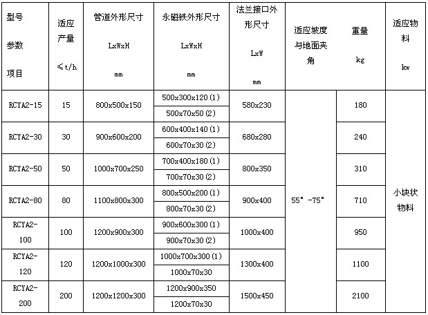 RCYA1、RCYA2系列管道式永磁除鐵器包括無(wú)磁管道和永磁鐵兩部分,****于對(duì)封閉管道內(nèi)非磁性物料除鐵、永磁除鐵器內(nèi)部采用高性能稀土強(qiáng)磁材料組成復(fù)合磁系。具有體積小、磁力大、重量輕、除鐵干凈、方便、無(wú)能耗、使用壽命長(zhǎng)等特點(diǎn)。適合于無(wú)輸送皮帶,只能提供下料溜槽的場(chǎng)合。當(dāng)散狀物料經(jīng)過(guò)管道式永磁除鐵器時(shí),鐵雜物被高場(chǎng)強(qiáng)的永磁鐵所吸附,清除鐵雜質(zhì)時(shí),打開(kāi)管道****門(mén)將雜質(zhì)取出。該設(shè)備適用于含鐵量較少的場(chǎng)合,含鐵較多的場(chǎng)合,應(yīng)選用自卸式除鐵器或RCYG系列精細(xì)除鐵器。主要應(yīng)用于水泥、化工、煤炭、塑料、耐火材料、建材等行業(yè)的下料管道中清除雜物。