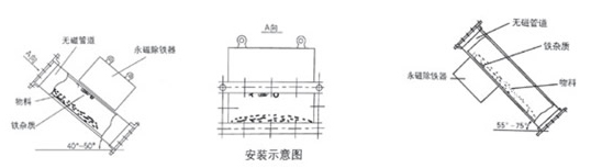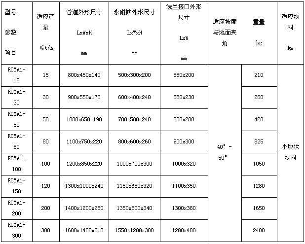 RCYA1、RCYA2系列管道式永磁除鐵器包括無(wú)磁管道和永磁鐵兩部分,****于對(duì)封閉管道內(nèi)非磁性物料除鐵、永磁除鐵器內(nèi)部采用高性能稀土強(qiáng)磁材料組成復(fù)合磁系。具有體積小、磁力大、重量輕、除鐵干凈、方便、無(wú)能耗、使用壽命長(zhǎng)等特點(diǎn)。適合于無(wú)輸送皮帶,只能提供下料溜槽的場(chǎng)合。當(dāng)散狀物料經(jīng)過(guò)管道式永磁除鐵器時(shí),鐵雜物被高場(chǎng)強(qiáng)的永磁鐵所吸附,清除鐵雜質(zhì)時(shí),打開(kāi)管道****門(mén)將雜質(zhì)取出。該設(shè)備適用于含鐵量較少的場(chǎng)合,含鐵較多的場(chǎng)合,應(yīng)選用自卸式除鐵器或RCYG系列精細(xì)除鐵器。主要應(yīng)用于水泥、化工、煤炭、塑料、耐火材料、建材等行業(yè)的下料管道中清除雜物。